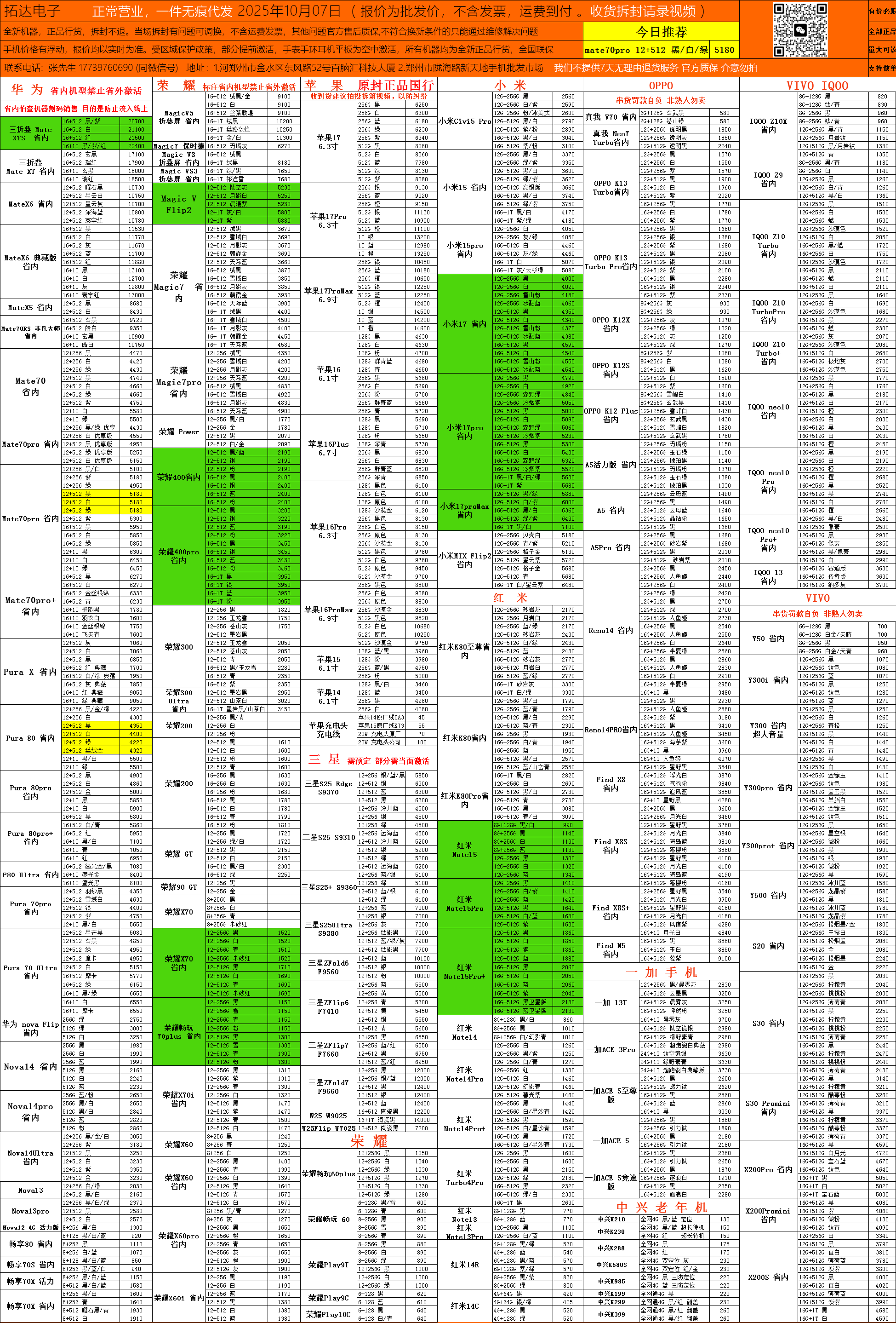 郑州科技市场手机批发报价-每日更新(2025-10-07)