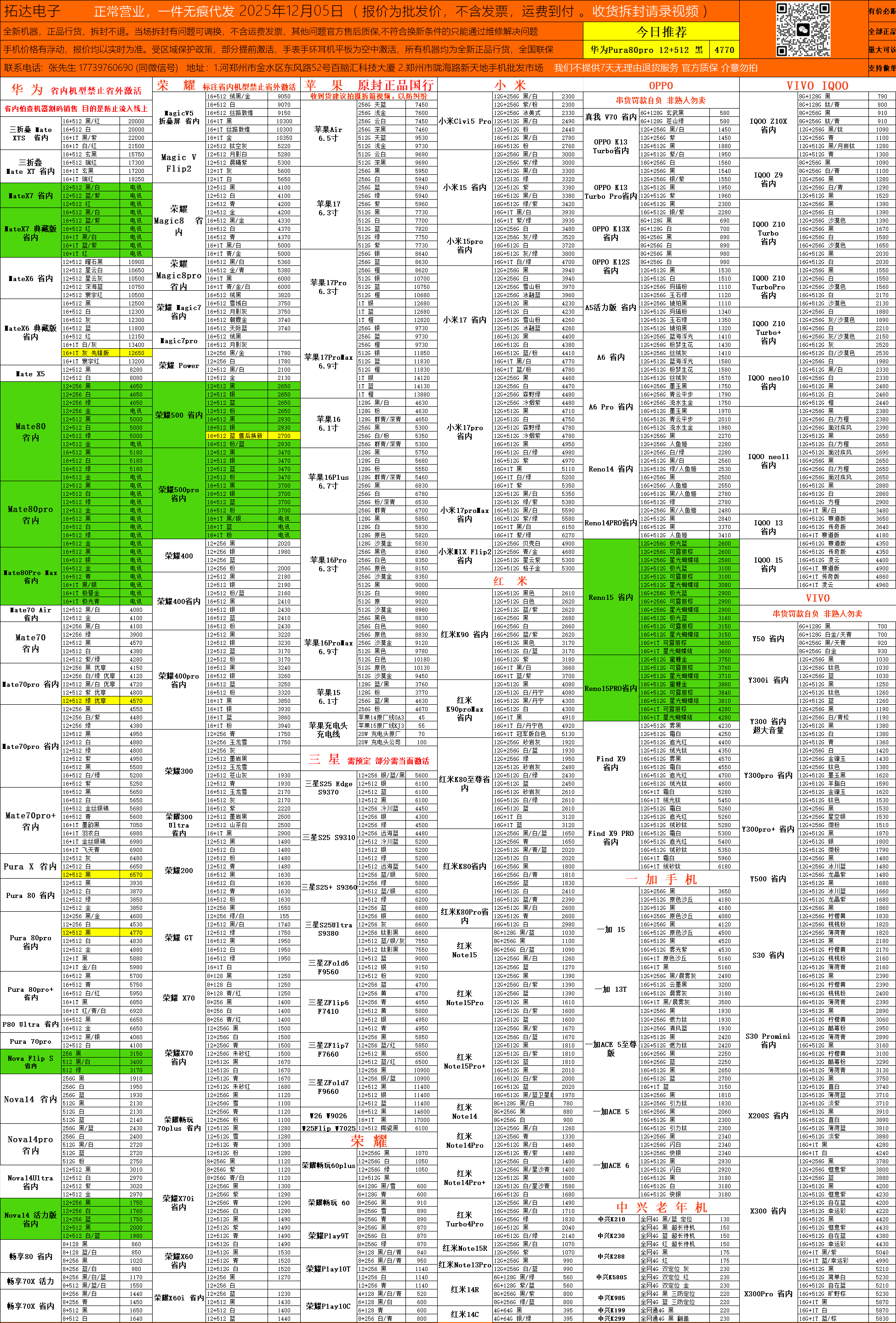 郑州科技市场手机批发报价-每日更新(2025-12-05)
