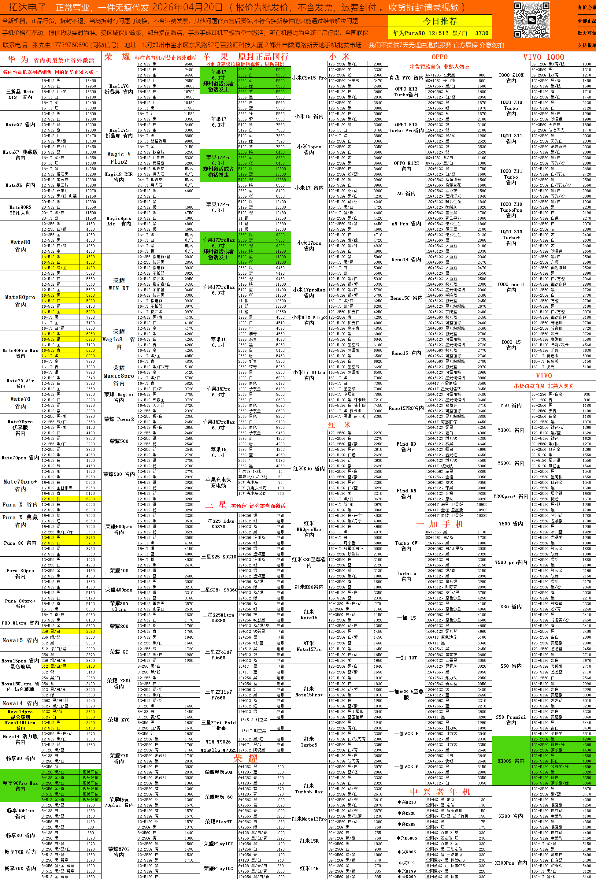 郑州科技市场手机批发报价-每日更新(2026-04-20)