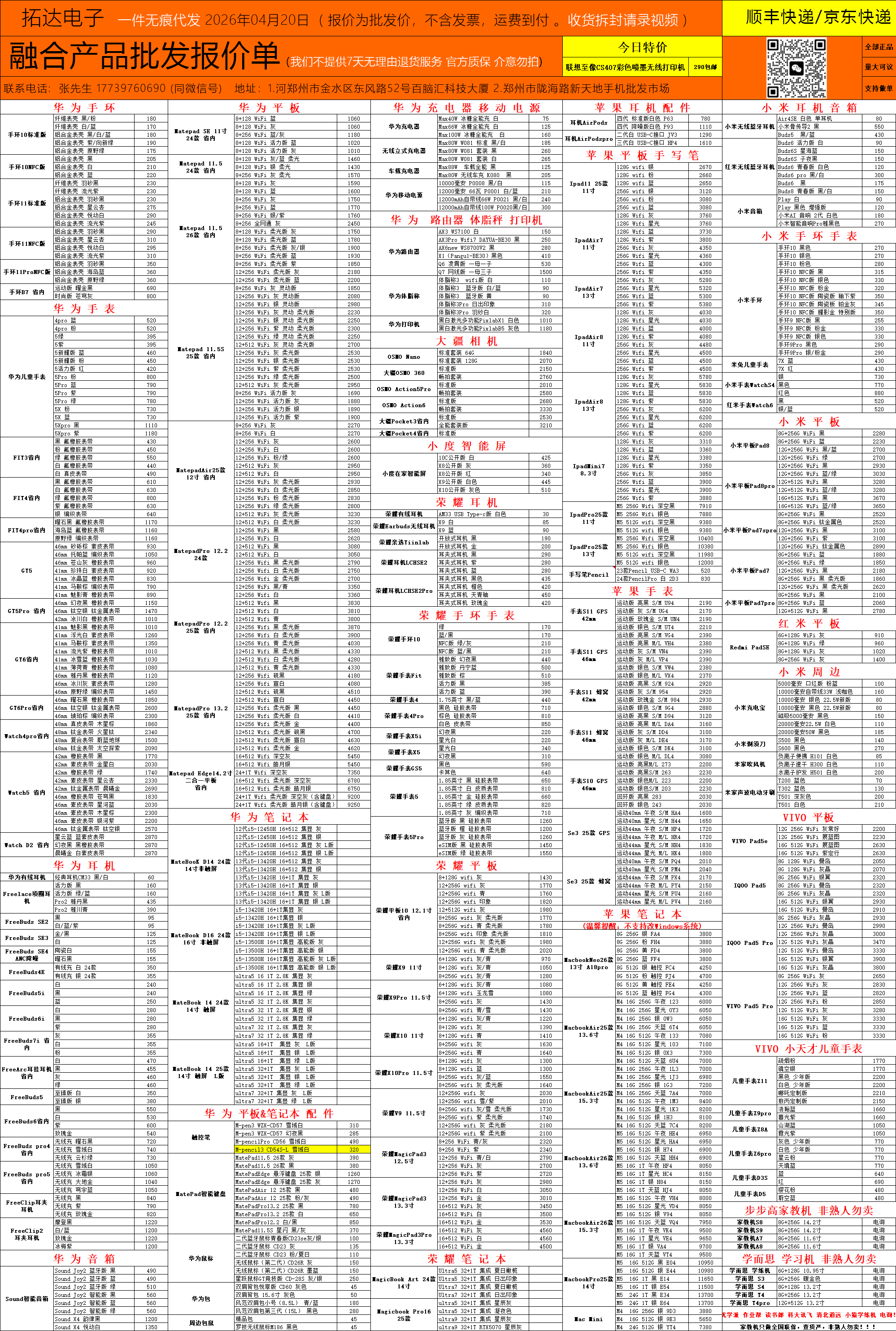 [融合报价] 郑州耳机手表平板 华为荣耀苹果小米OPPO VIVO报价单