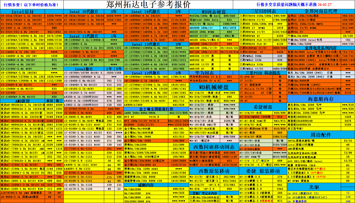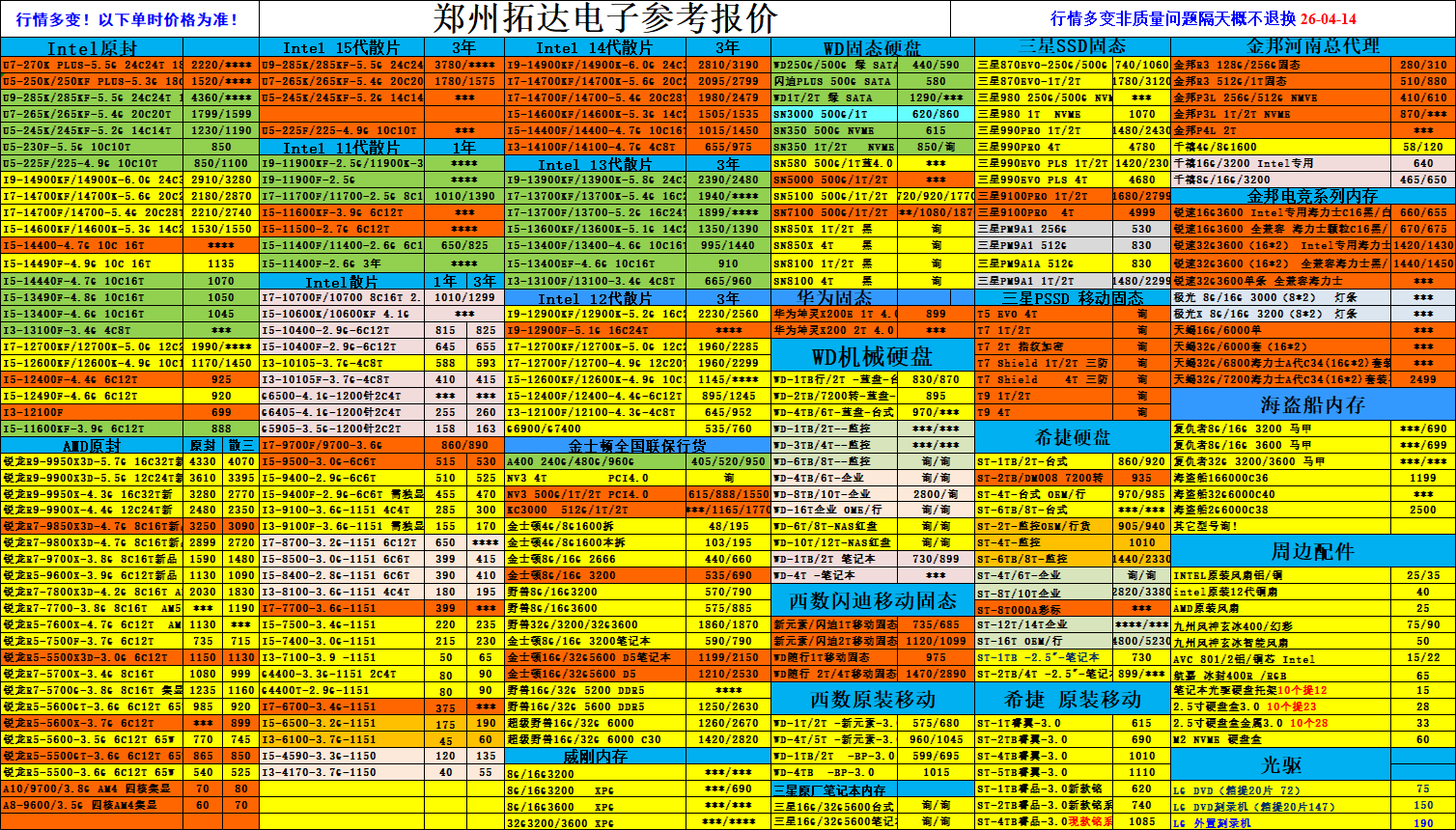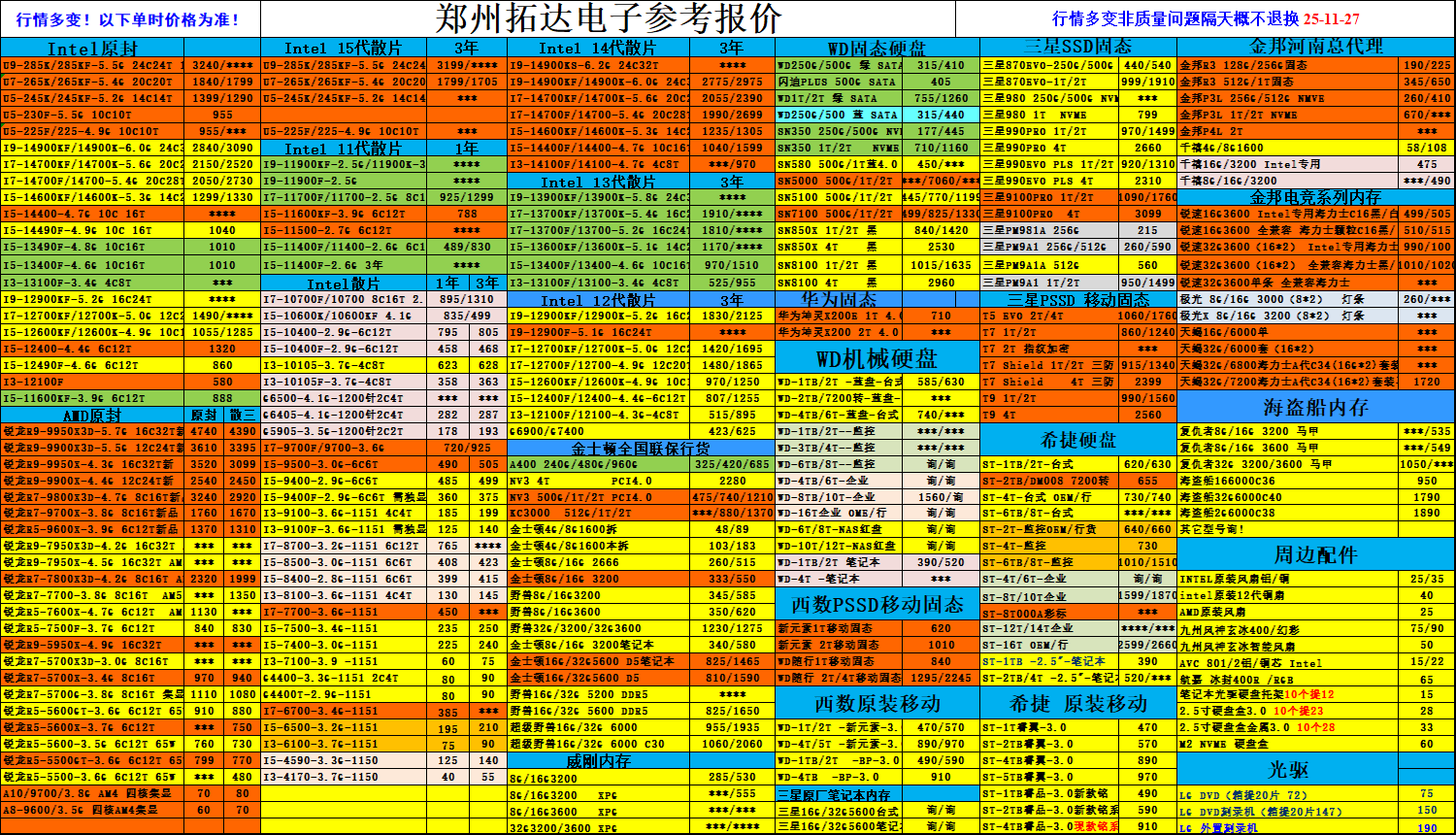 [CPU内存硬盘] 河南郑州科技市场DIY散件当日报价
